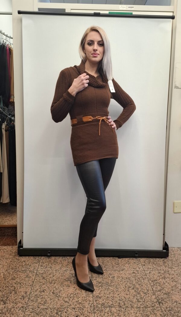 Ženski pleten pulover s pasom oz. tunika/obleka odvisno od vaše dolžine. Material: 100% akril. Velikost: UNISIZE in je primerna za velikosti XS, S, M, L. Barva: RJAVA. Dostava: 1-2 dni. Model nosi velikost S, visoka je 170cm. Artikel je v celoti izdelan v ITALIJI.