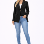 Eleganten ženski blazer/rekelc z dolgimi rokavi in zapenjanje na gumb. izdelan je iz kakovostnega in udobnega materiala, kjer viskoza omogoča zračnost in udobje. Klasičen kroj omogoča enostavno kombiniranje z elegantnimi ali vsakodnevnimi oblačili.