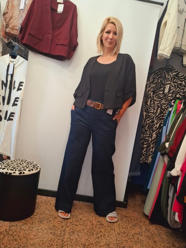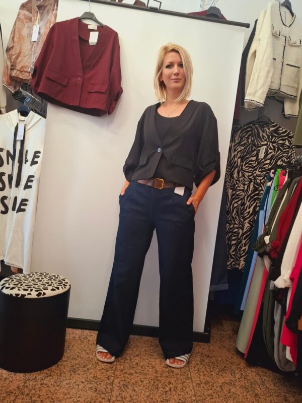 Čudovit modni eleganten blazer z dolgimi rokavi z možnostjo regulacije na 3/4 rokav z gumbom. Na sredini ima gumb za zapenjanje.