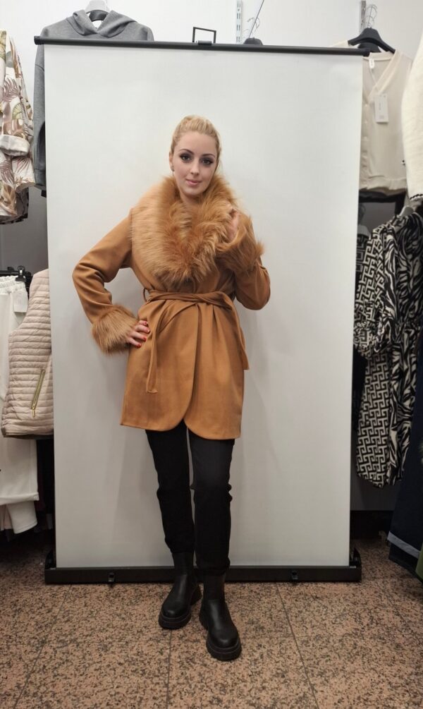 Krajši ženski plašč vam zagotavlja udobje in toplino, zdeužuje razkošje krznega ovratnika s trpežnostjo svoji materialov. Popoln izdelek za vse priložnosti.