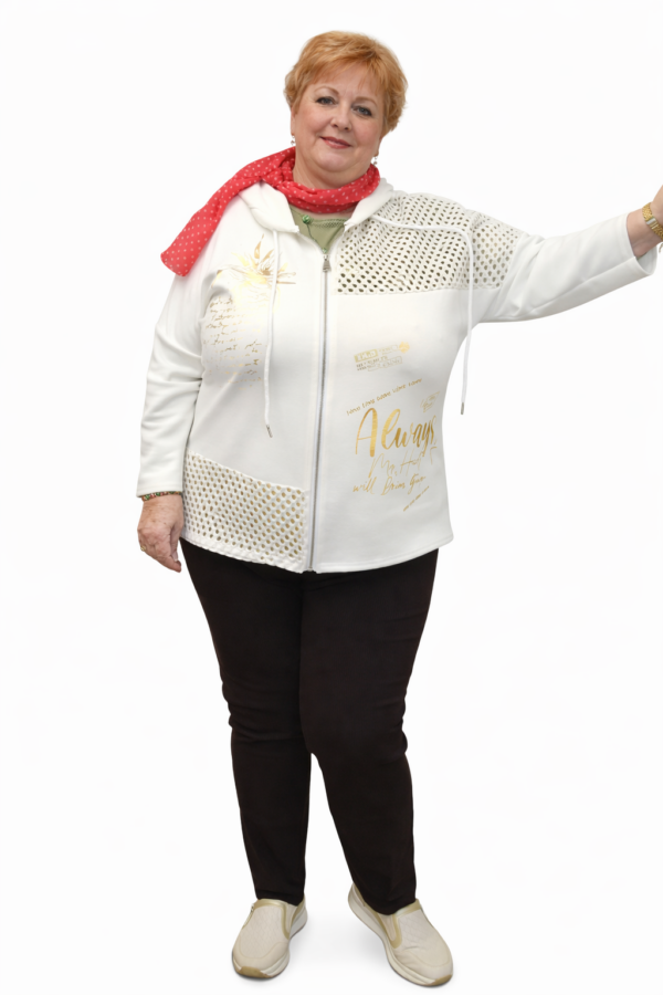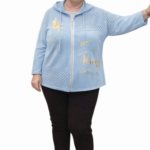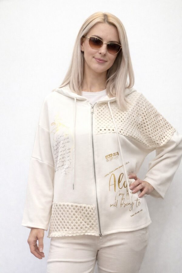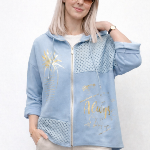 Jopica ali tanjša jakna z zadrgo in zlatim potiskom. Asimetričen kroj z rahlo podaljšanim zadnjim delom. Zelo modni kos za razne kombinacije. Je zračna, zato se boste v njej počutili lahkotno in sproščeno.