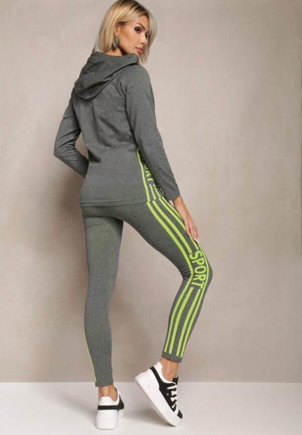 Komplet vsebuje športno jopico s kapuco, brezrokavno majico in legice.