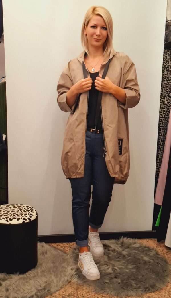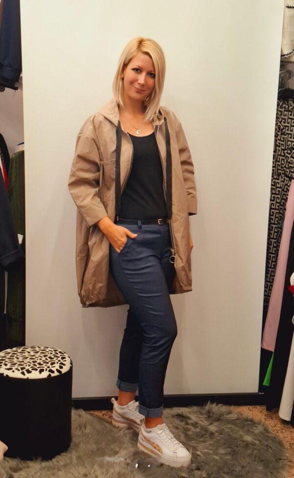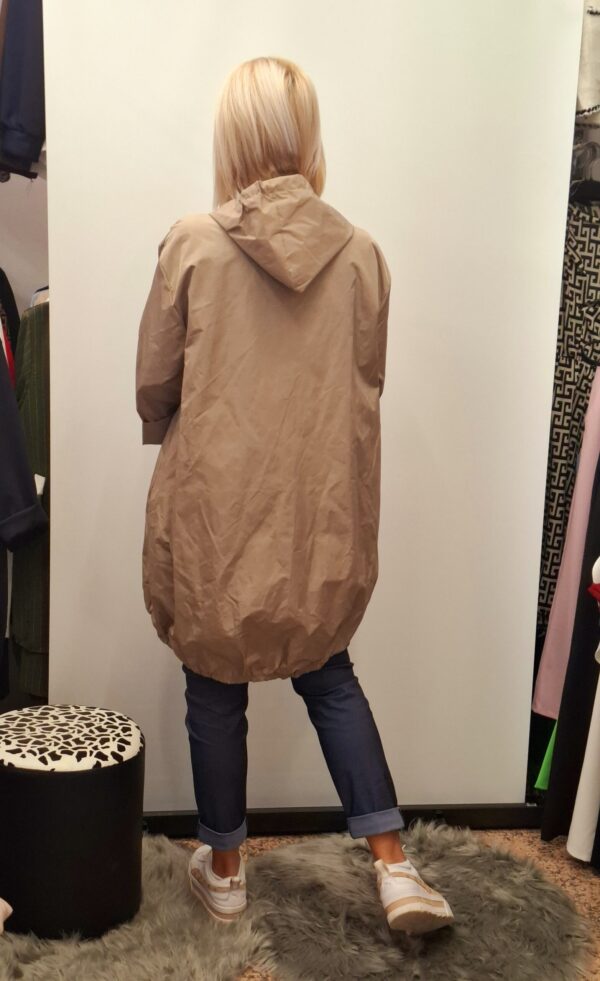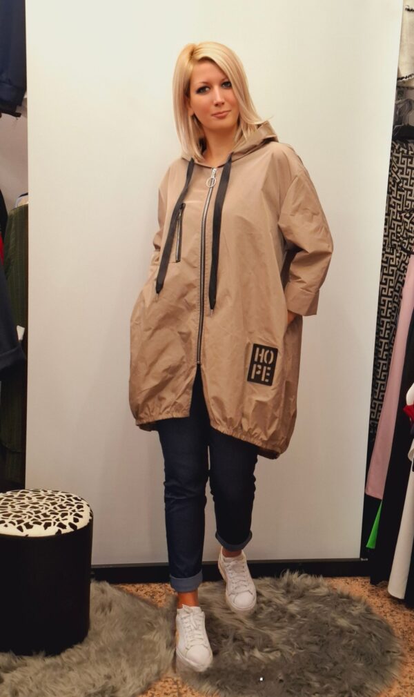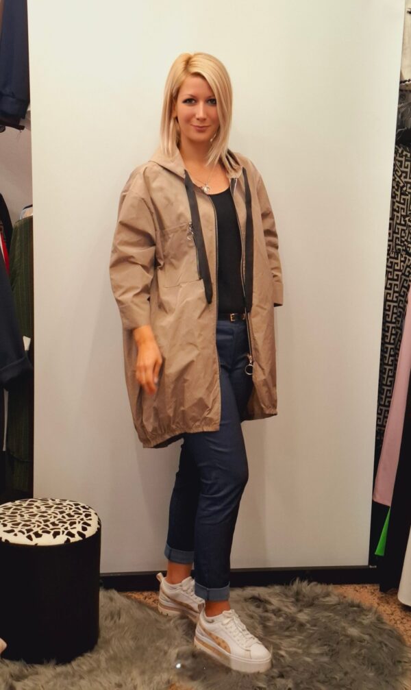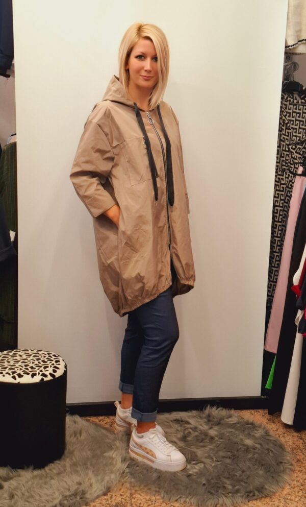 Ženska tanjša jakna/vetrovka ali plašč v kroju A. Ima dolge rokave in kapuco.