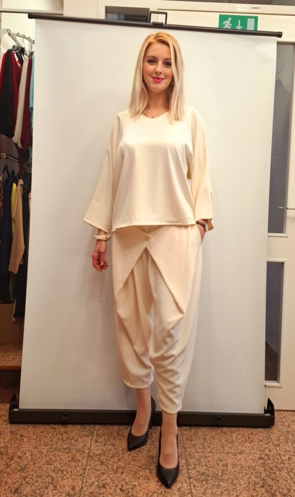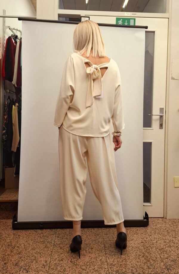 Pentlja na hrbtu doda ženstven in prefinjen videz. Bluza ima ohlapen kroj in 3/4 rokave, zato je primerna za različne tipe postav. Odlično se kombinira s hlačami kot s krili ali kavbojkami.
