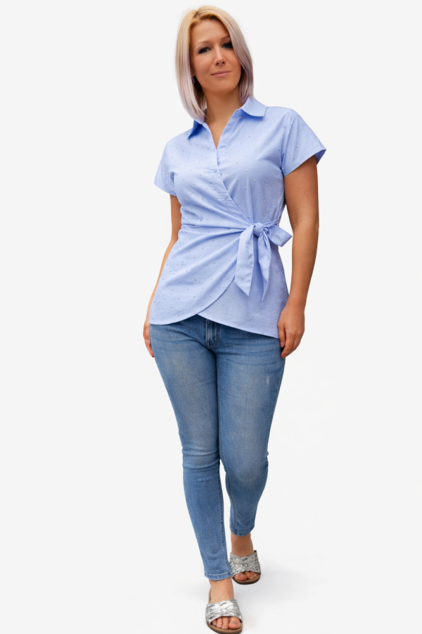 Čudovita bluza na vezanje iz mehkega materiala. Zelo lepo se poda na hlače jeans.