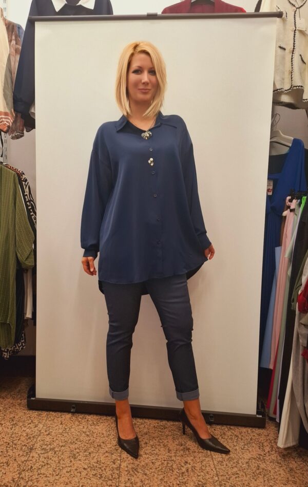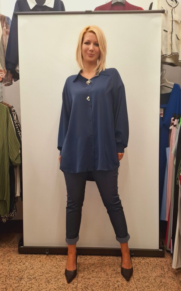 Ženska kompaktna bluza sproščenega kroja in lepega videza. Broški, ki sta pripeti na bluzi dodata eleganco in ženstvenost in sta snemljivi.