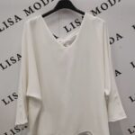 Ženska kompaktna bluza sproščenega kroja in lepega videza. Broški, ki sta pripeti na bluzi dodata eleganco in ženstvenost in sta snemljivi.