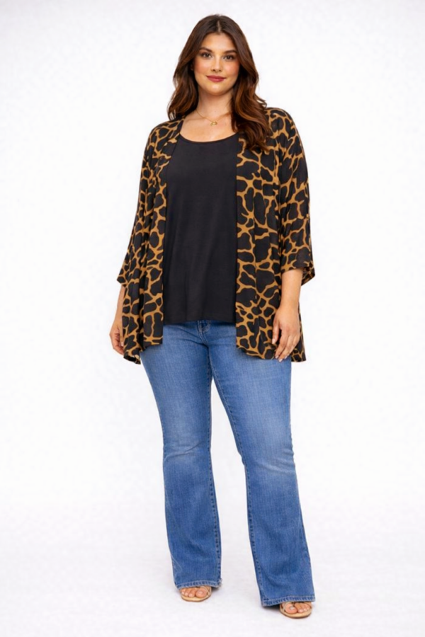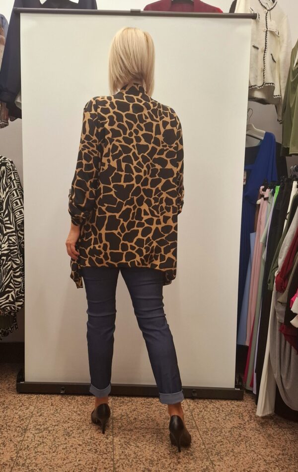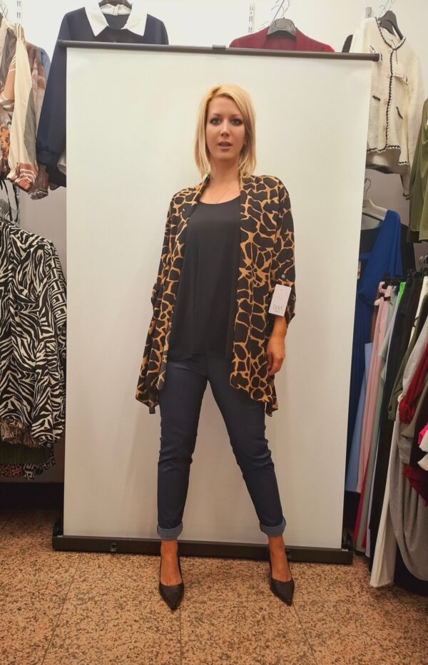 Stilska bluza z všito jopico v črno-rjavem vzorcu – praktičen 2 v 1 kos. Rokavi se lahko nosijo dolgi ali skrajšani z gumbom, kar omogoča prilagodljivost za dolžino rok. Majčka spodaj je elastična.