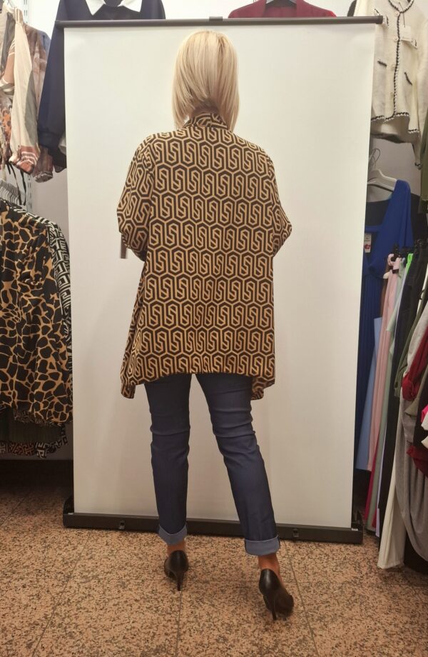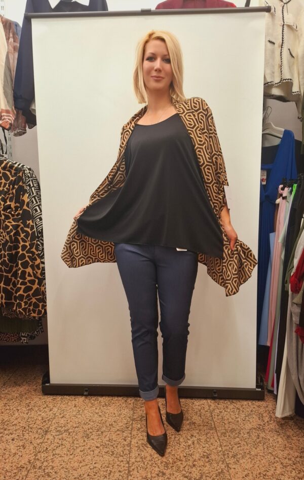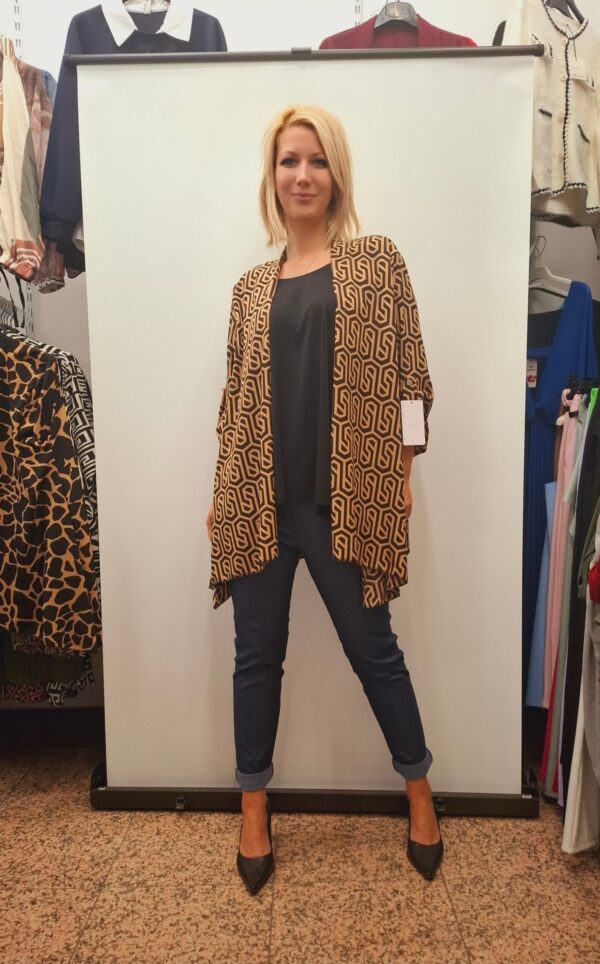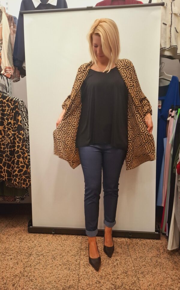 Stilska bluza z všito jopico z vzorci – praktičen 2 v 1 kos. Rokavi se lahko nosijo dolgi ali skrajšani z gumbom, kar omogoča prilagodljivost za dolžino rok. Majčka spodaj je elastična.