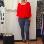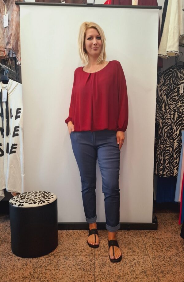 Elegantna ženska bluza z dolgimi rokavi. Zgornji del kot tančica, viskozna podloga pa elastična s patentom na boku. Lahkotna in lepo pade.