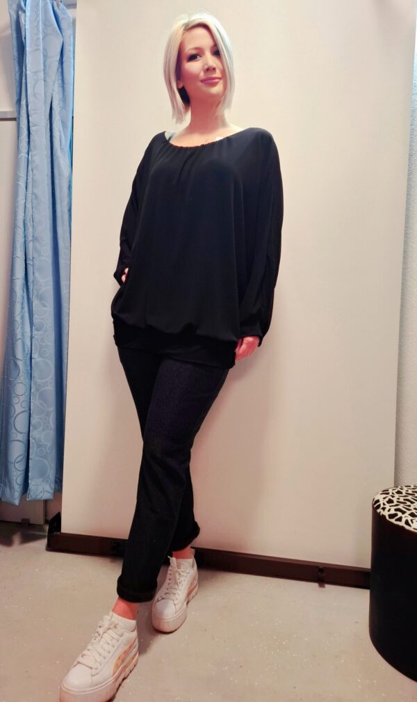 Tančičasta bluza z dolgimi rokavi. Zgornji del kot tančica, viskozna podloga pa elastična s patentom na boku. Širokega kroja z ladijskim ovratnikom. Lahkotna in lepo pade. Zelo lepo se poda večjim konfekcijskim številkam.