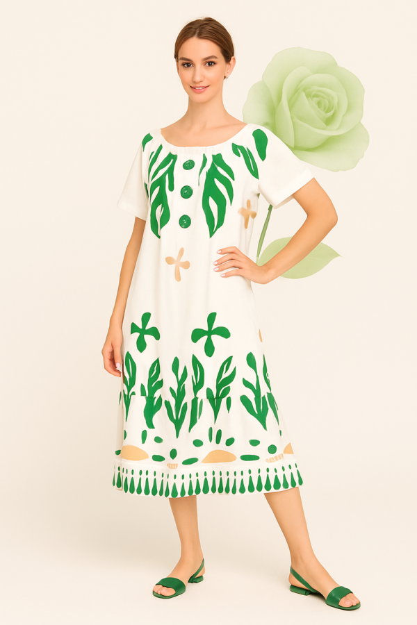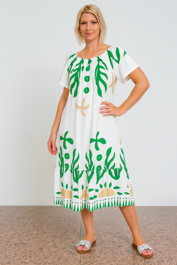 Elegantna poletna obleka z živahnim zelenim potiskom bo navdušila s svojo zračnostjo in udobjem.
