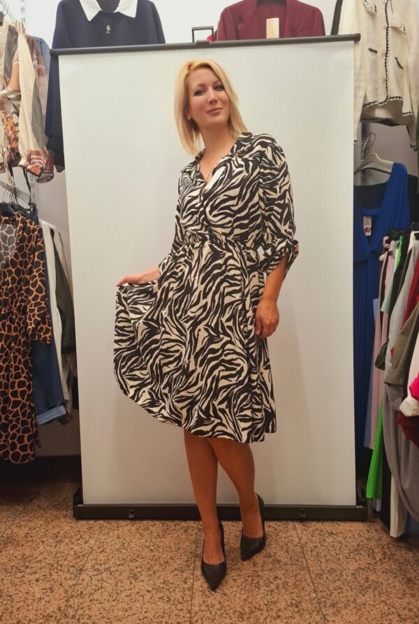 Čudovita elegantna obleka s čudovitim zebrastim vzorcem. Obleka je srednje dolžine, kroj je rahlo razširjen v spodnjem delu in lepo poudari pas. Rokavi so dolgi z možnostjo regulacije na 3/4 z gumbom.