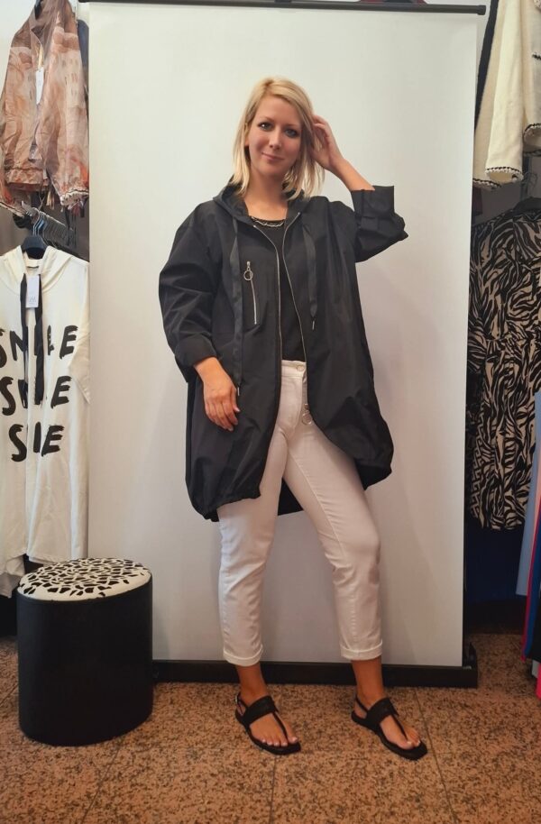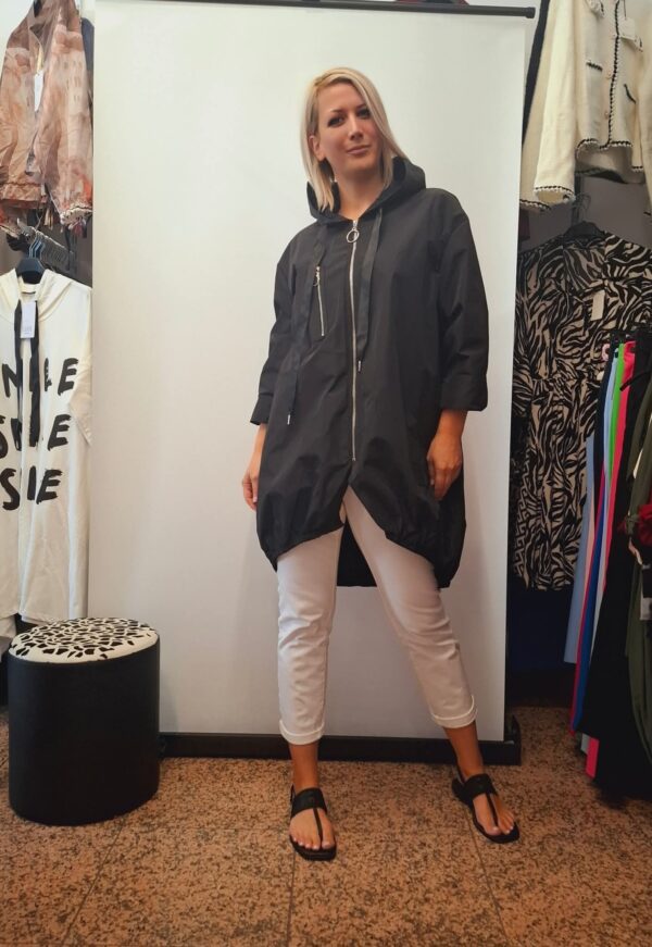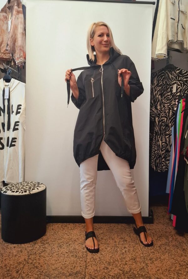 Ženska tanjša jakna/vetrovka ali plašč v kroju A. Ima dolge rokave in kapuco.