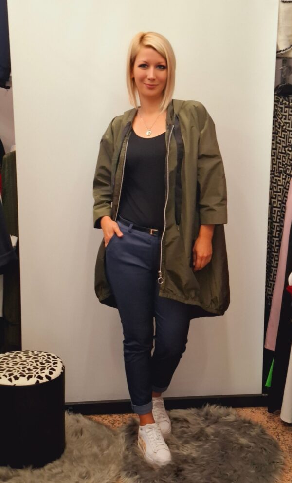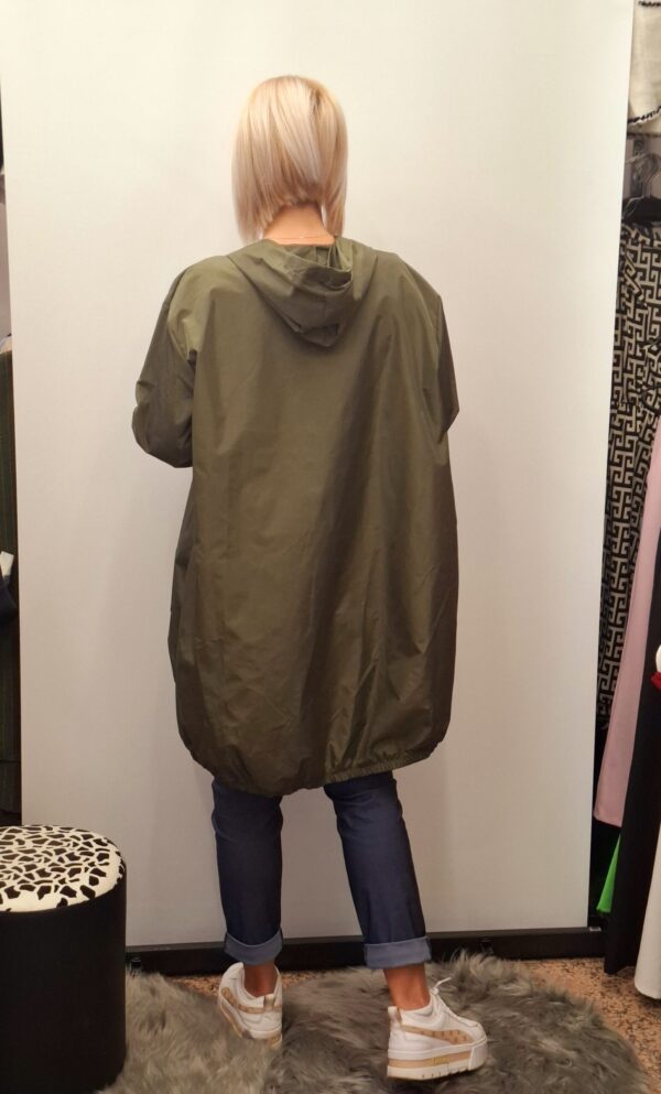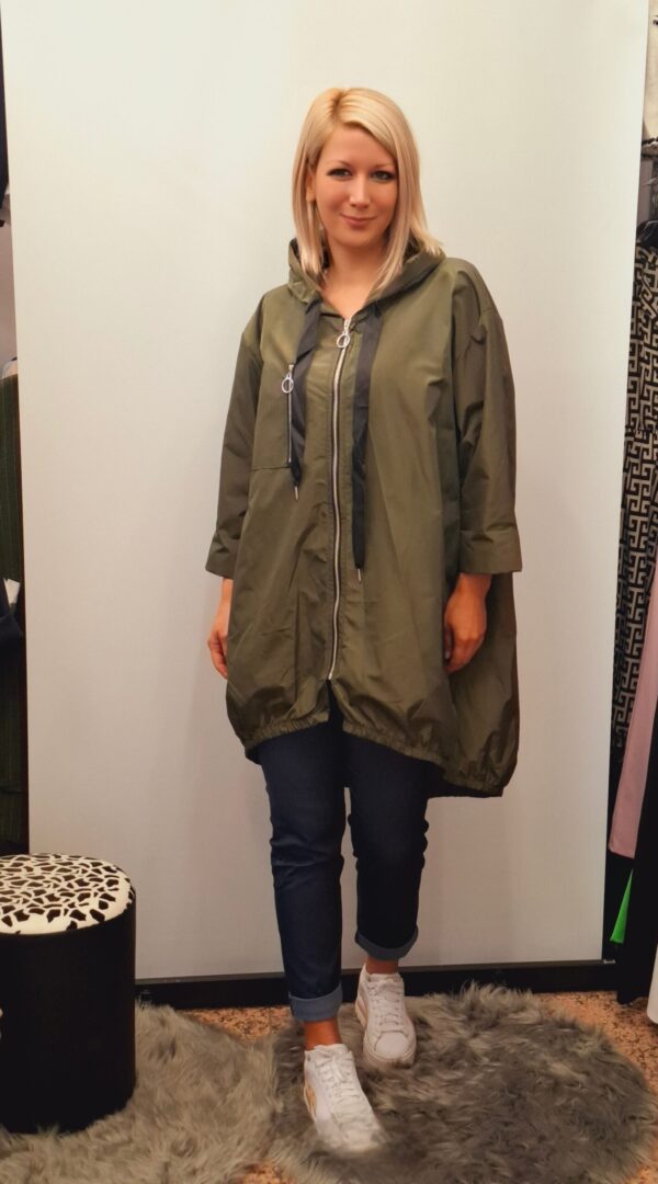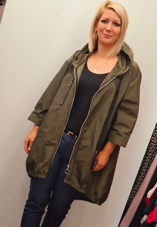 Ženska tanjša jakna/vetrovka ali plašč v kroju A. Ima dolge rokave in kapuco.