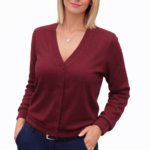 Elegantna ženska jopica z V-izrezom in gumbi. Mehak in prijeten material zagotavlja udobje skozi ves dan. Popolna izbira za vsakodnevne ali poslovne kombinacije.