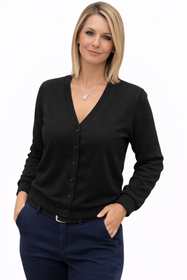 Elegantna ženska jopica z V-izrezom in gumbi. Mehak in prijeten material zagotavlja udobje skozi ves dan. Popolna izbira za vsakodnevne ali poslovne kombinacije.