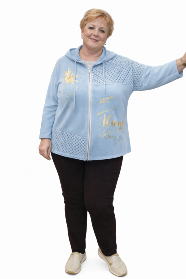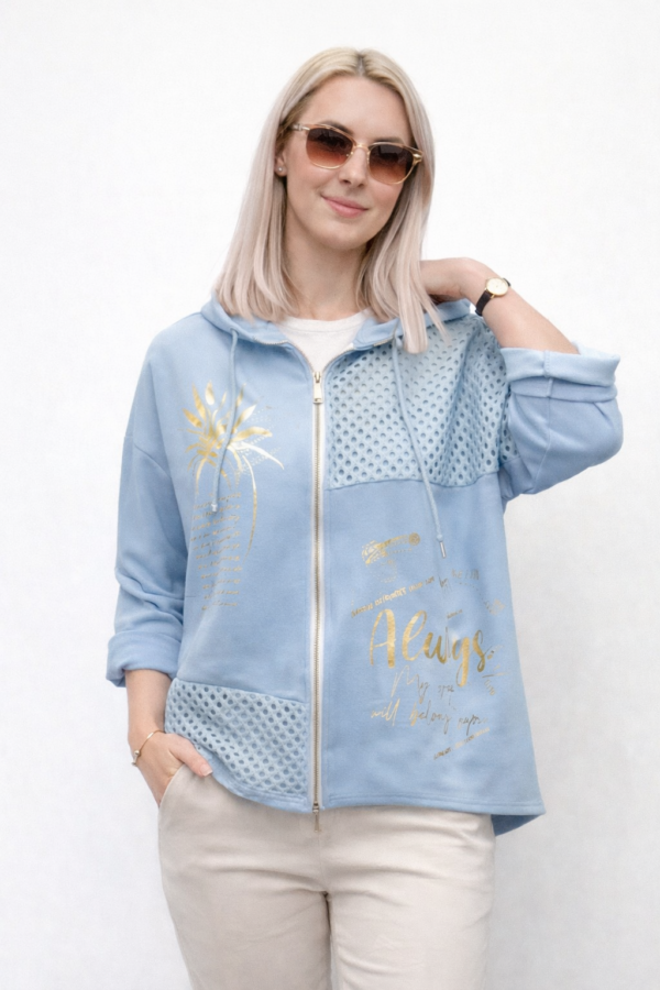 Jopica ali tanjša jakna z zadrgo in zlatim potiskom. Asimetričen kroj z rahlo podaljšanim zadnjim delom. Zelo modni kos za razne kombinacije. Je zračna, zato se boste v njej počutili lahkotno in sproščeno.