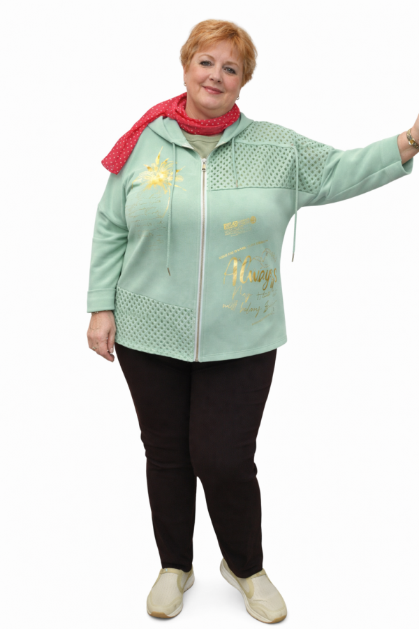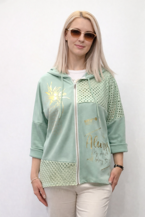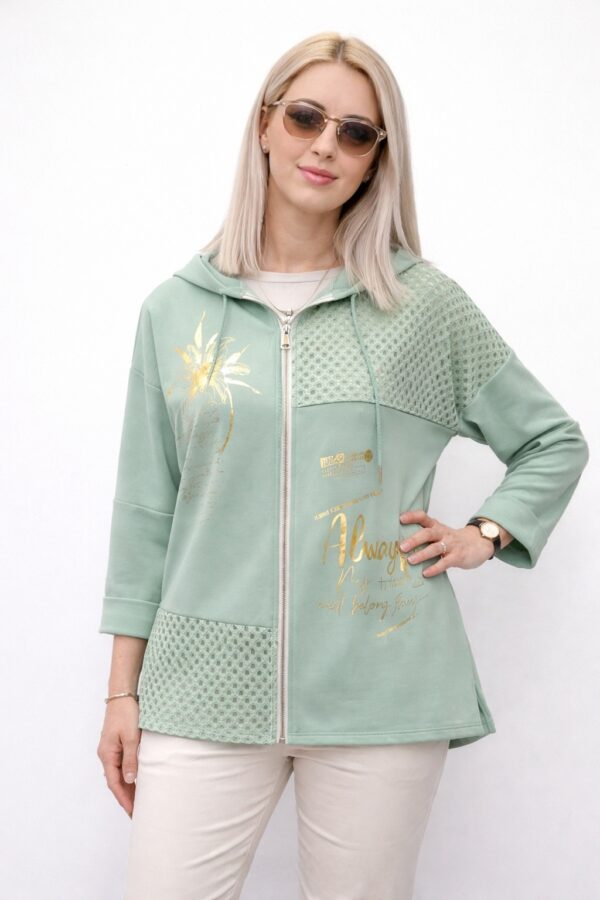 Jopica ali tanjša jakna z zadrgo in zlatim potiskom. Asimetričen kroj z rahlo podaljšanim zadnjim delom. Zelo modni kos za razne kombinacije. Je zračna, zato se boste v njej počutili lahkotno in sproščeno.