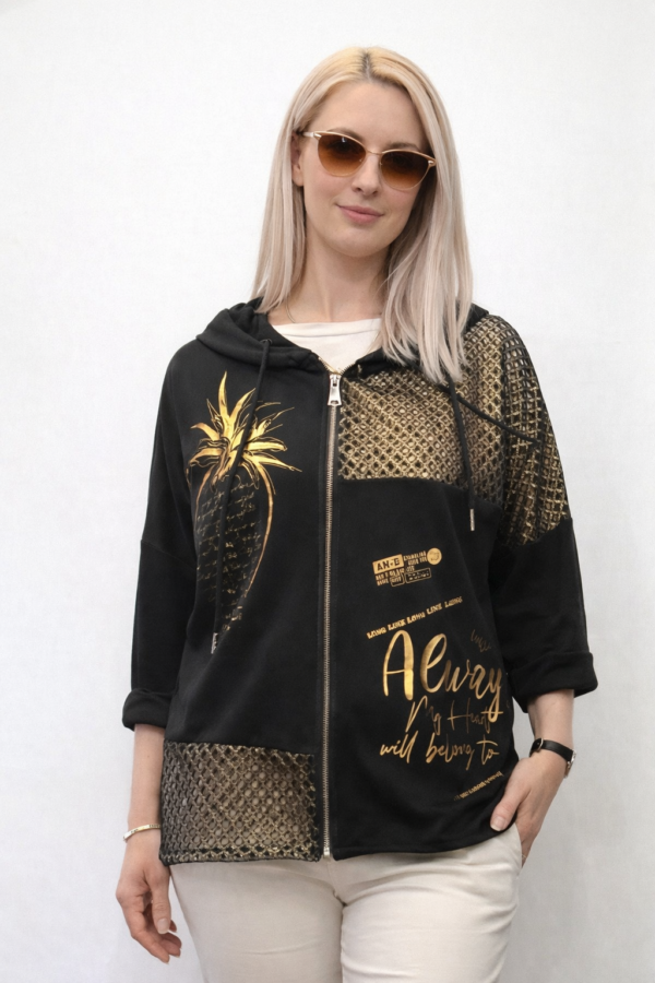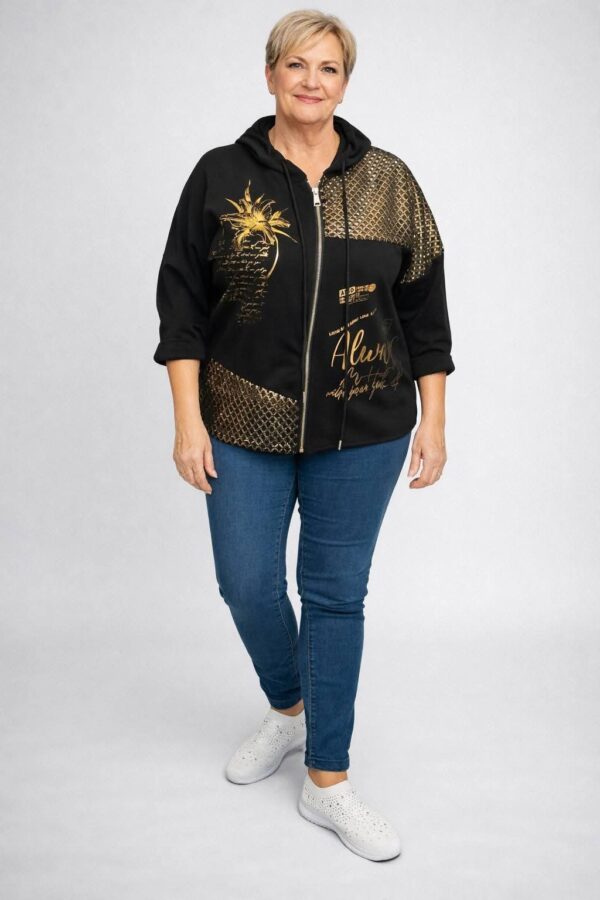 Jopica ali tanjša jakna z zadrgo in zlatim potiskom. Asimetričen kroj z rahlo podaljšanim zadnjim delom. Zelo modni kos za razne kombinacije. Je zračna, zato se boste v njej počutili lahkotno in sproščeno.