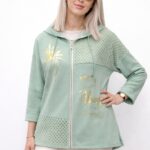 Jopica ali tanjša jakna z zadrgo in zlatim potiskom. Asimetričen kroj z rahlo podaljšanim zadnjim delom. Zelo modni kos za razne kombinacije. Je zračna, zato se boste v njej počutili lahkotno in sproščeno.