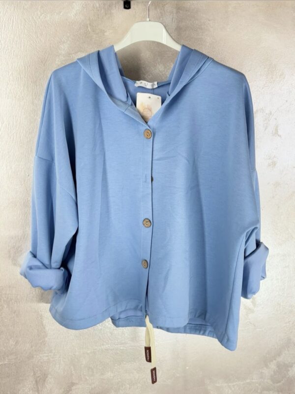 Ženska jopa z dolgimi rokavi. Ima kapuco. Na spodnjem robu ima všito vrvico za prilagajanje velikosti.