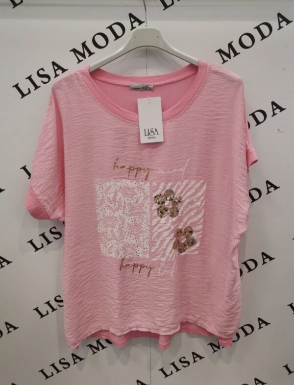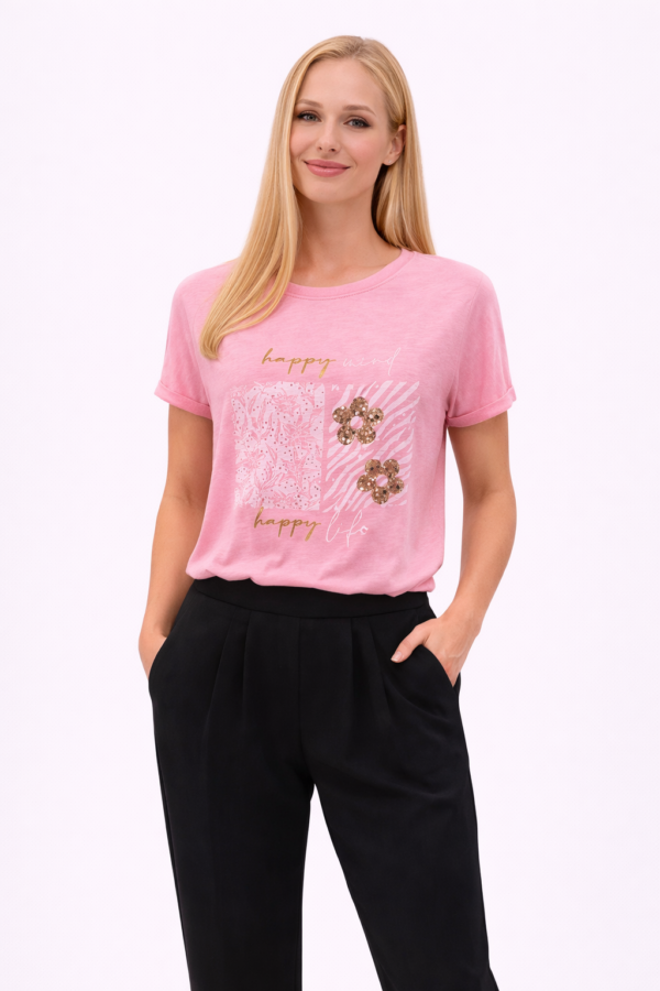 Udobna ženska majica z modernim potiskom na sprednji strani. Mehak in prijeten material zagotavlja udobje skozi ves dan ter je primeren za sproščene in vsakodnevne kombinacije.