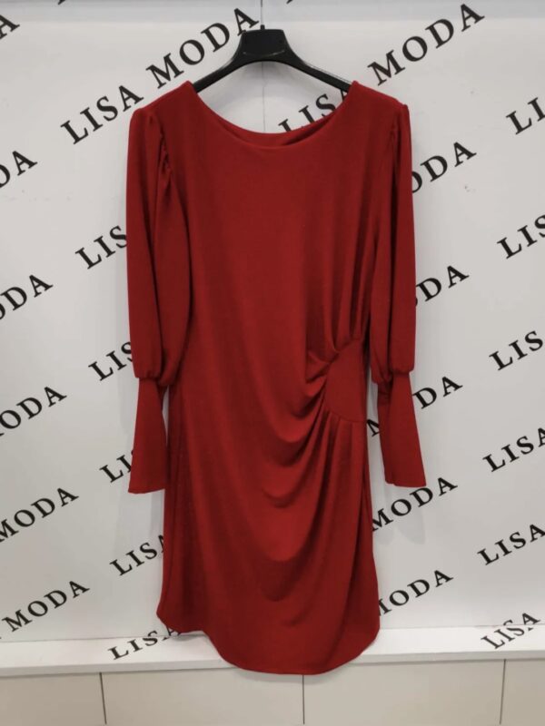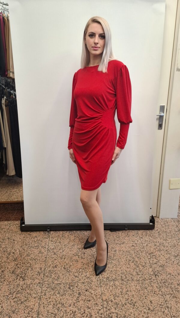 Praznična obleka z bleščicami, ki je z nabrano tkanino v trebušnem predelu je izredno laskav, saj vizualno oblikuje postavo in prikrije trebušček.