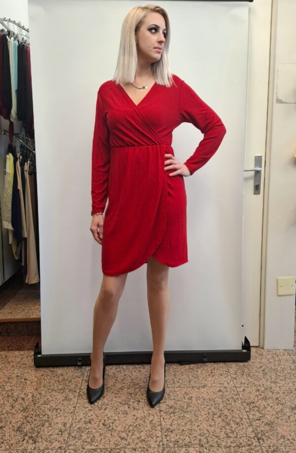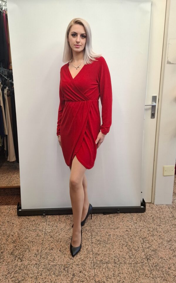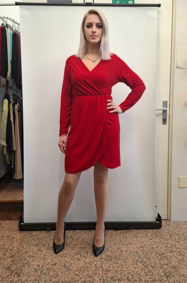 Praznična obleka z bleščicami, ki je z nabrano tkanino v trebušnem predelu je izredno laskav, saj vizualno oblikuje postavo in prikrije trebušček.
