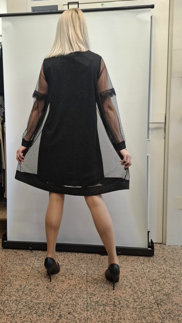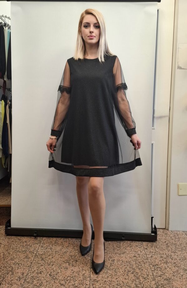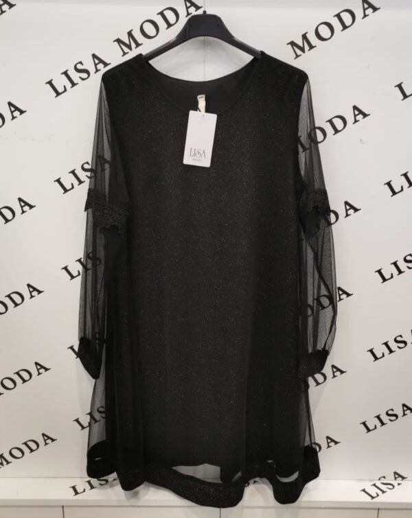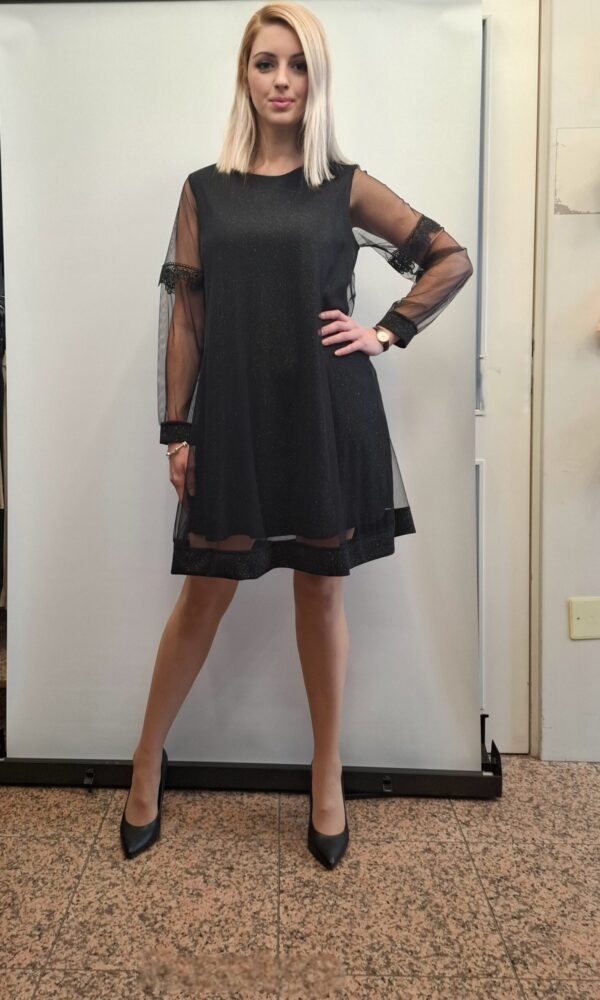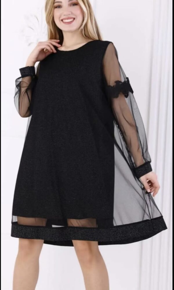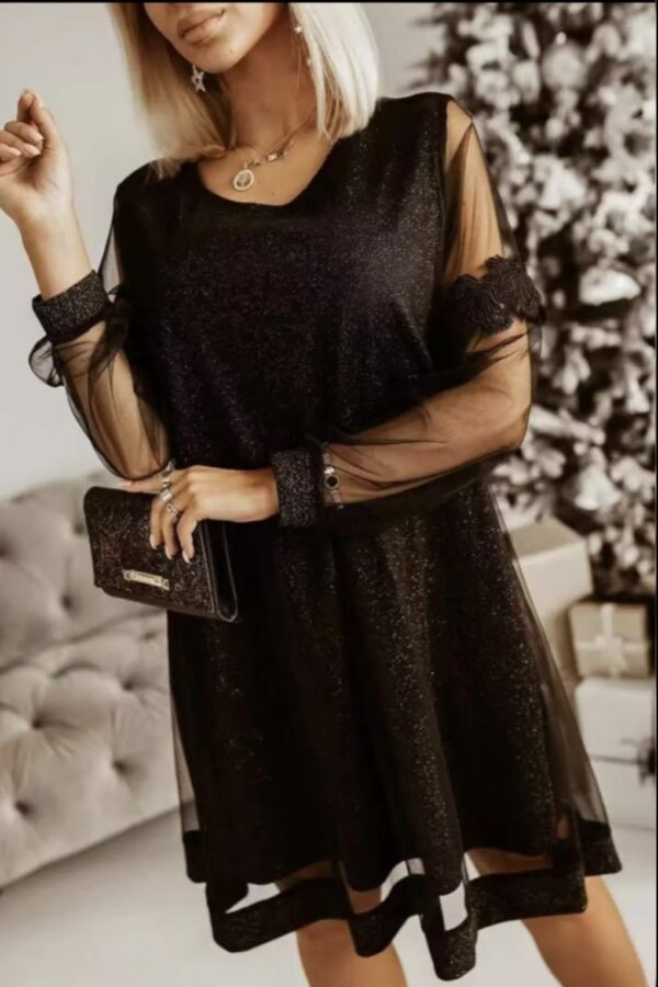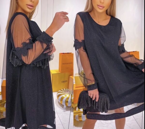 Bleščeča ženska obleka z dodatkom tila na rokavih in spodnjem delu.