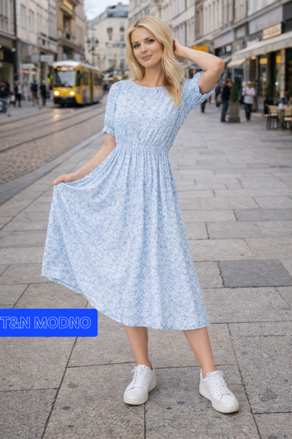 Čudovita dolga obleka, ki lepo pada. Lepo poudari pas. Rokavi so kratki. Nosite jo lahko tudi na superge.