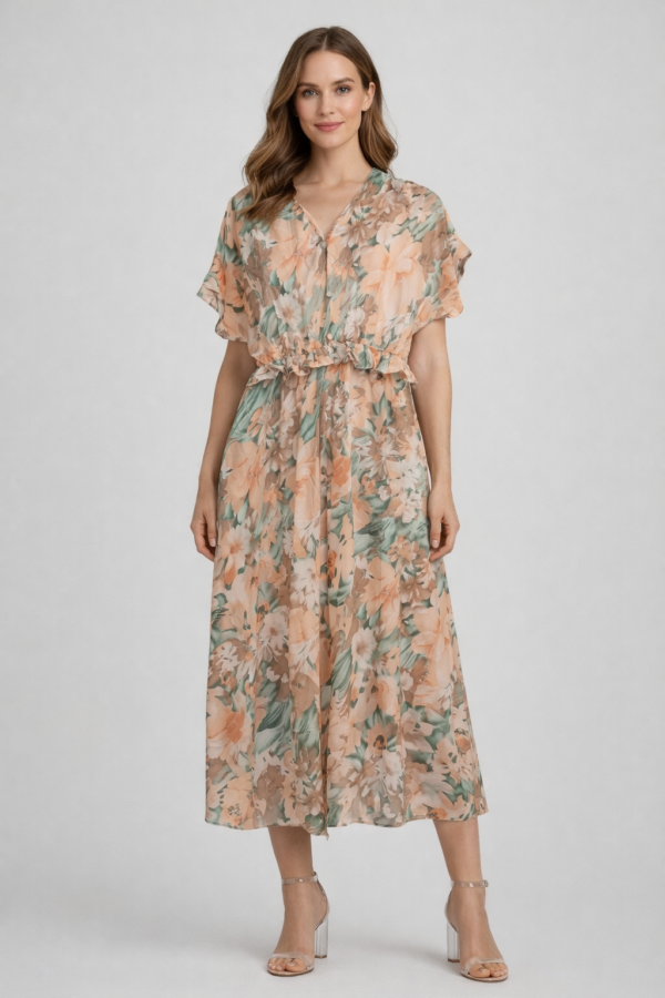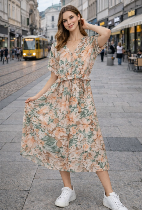 Čudovita dolga obleka, ki lepo pada. Lepo poudari pas. Rokavi so kratki. Nosite jo lahko tudi na superge.