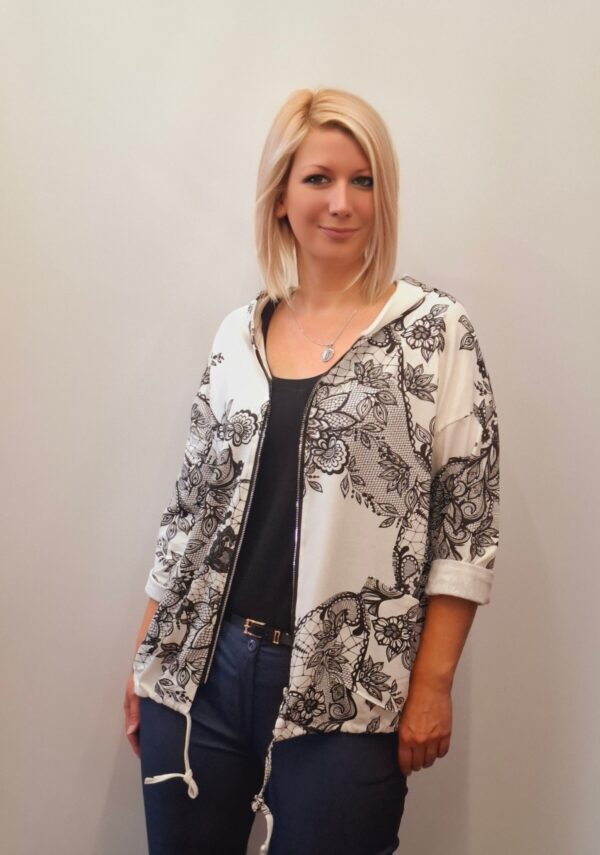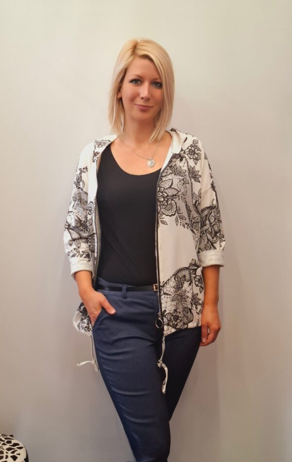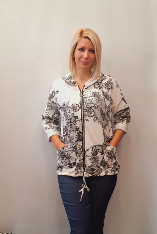 Ženska bombažna jopa s kapuco in zadrgo. Na spodnjem robu ima všito vrvico za prilagajanje velikosti.