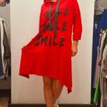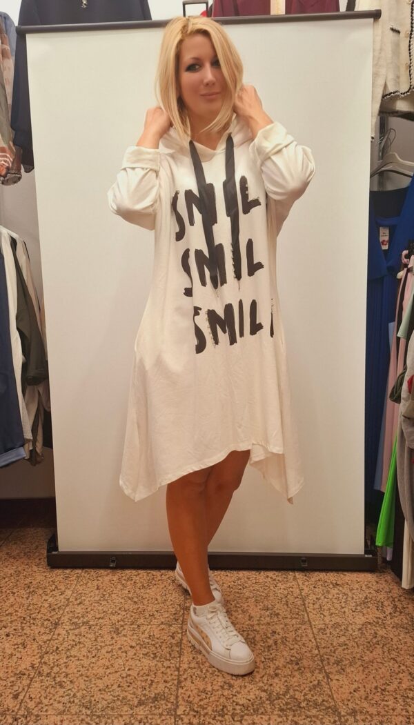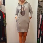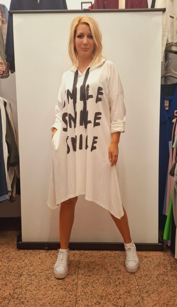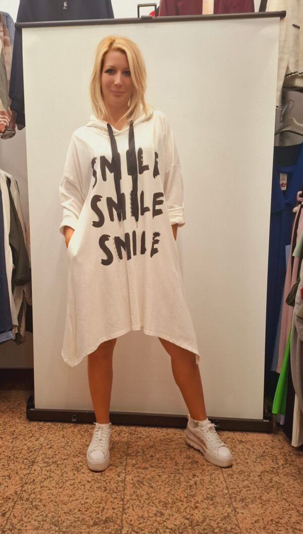 Ženska tunika/obleka na A kroj s potiskom. Ima kapuco in dolge rokave, ki jih lahko zavihate po vaši želji. Nosite jo lahko samostojno oz. odvisno od vaše dolžine. Pri straneh ima žepe.