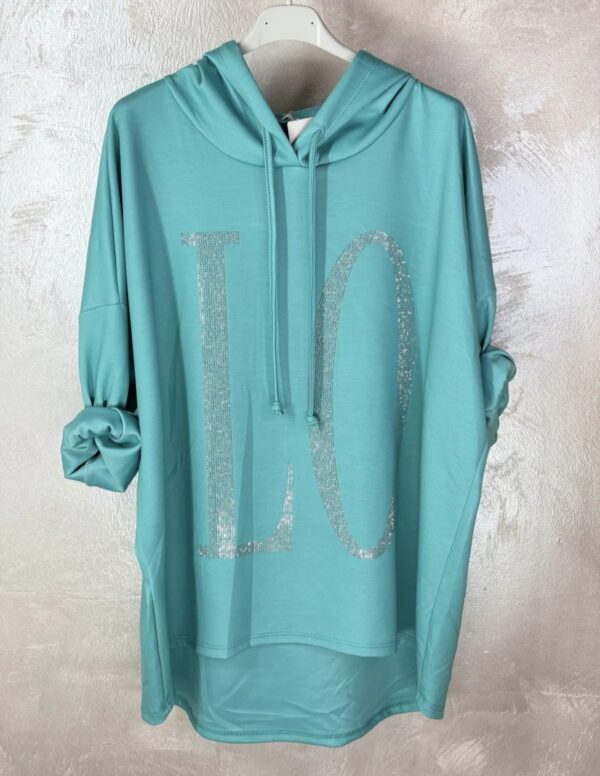 Ženska tunika na A kroj s potiskom. Ima kapuco in dolge rokave, ki jih lahko zavihate po vaši želji.