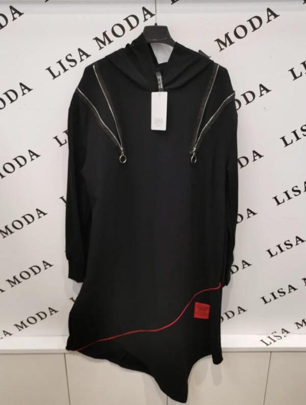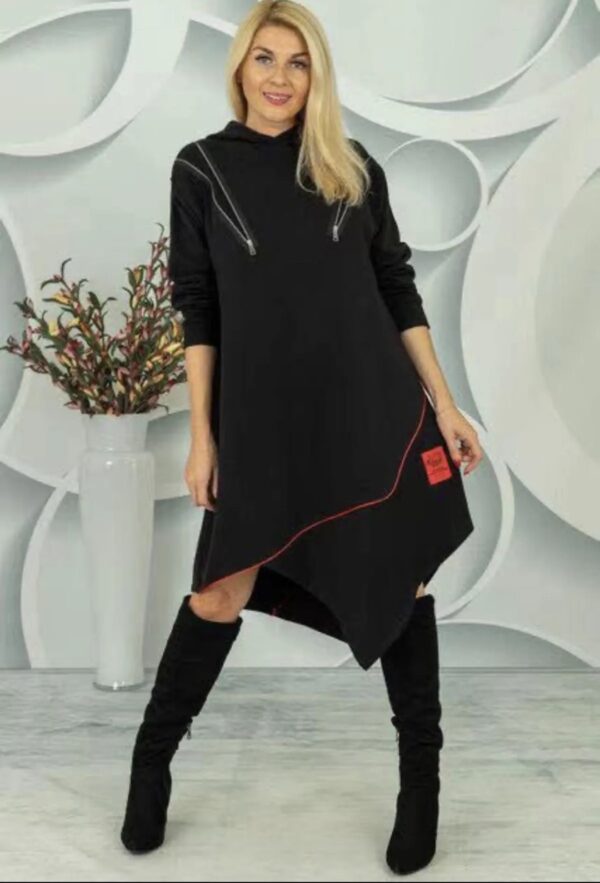 Moderna črna obleka/tunika z asimetričnim krojem je popolna izbira za ženske, ki želijo združiti udobje in modni videz. Ohlapen kroj lepo pade ob telesu in omogoča svobodo gibanja, medtem ko kapuca in dekorativne zadrge dodajo trendovski, urban značaj.