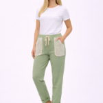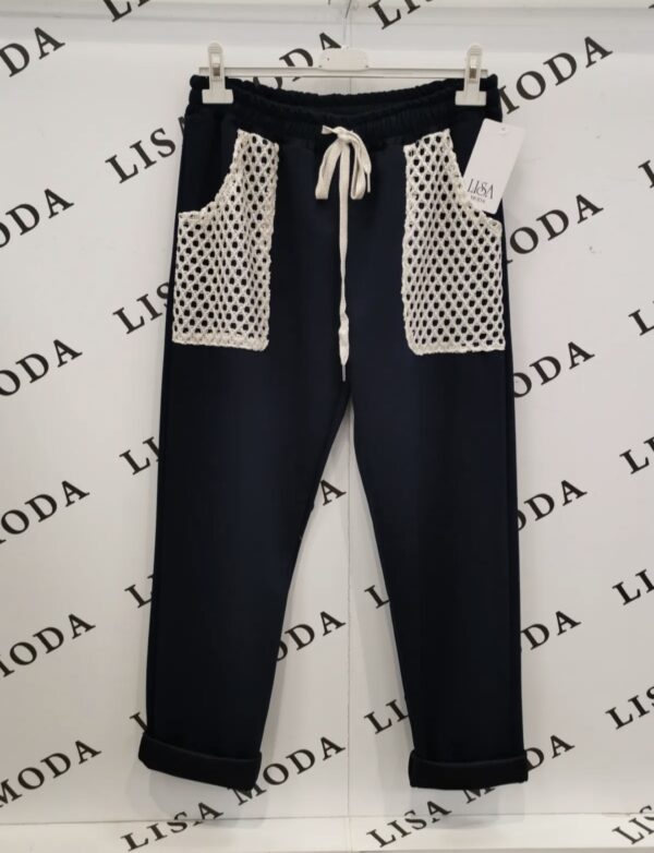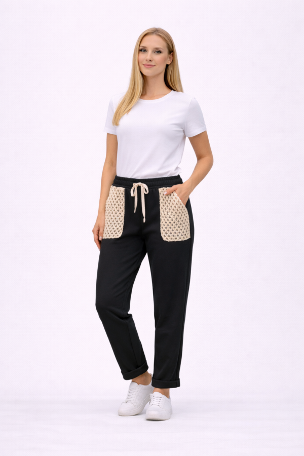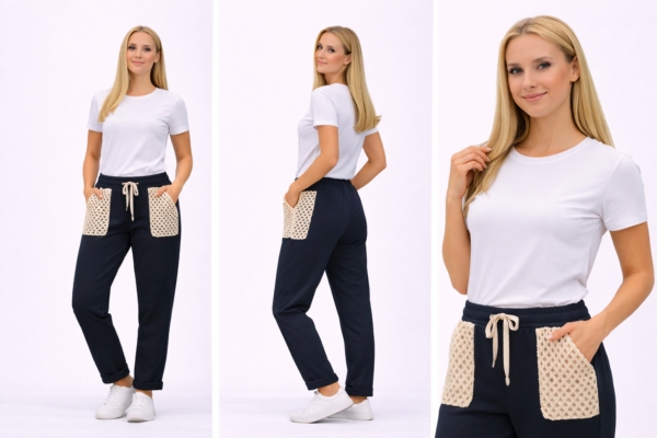 Udobne ženske hlače z elastičnim pasom in vrvico za prilagajanje. Mehka in zračna tkanina omogoča udobno nošenje. Moderen dizajn z dekorativnimi žepi spredaj je idealen za vsakodnevne in sproščene kombinacije.