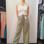 Modne kompaktne hlače širokega kroja. V pasu je všita elastika.