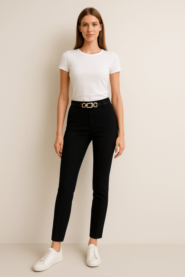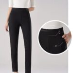 Ženske elastične hlače imajo višji pas. Kroj je ozek in raztegljiv.