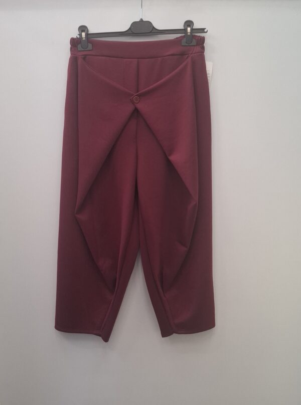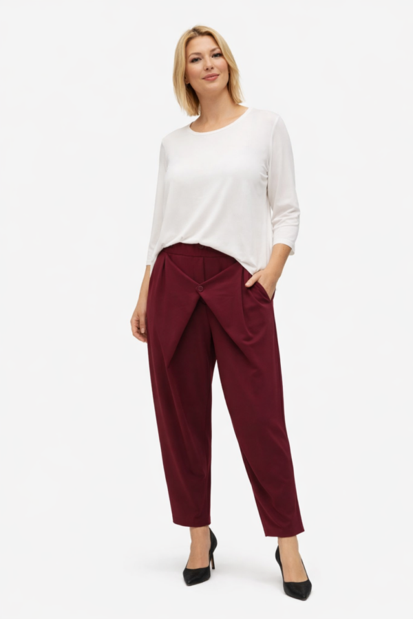 Moderne hlače z visokim pasom in izrazitim preklopnim detajlom spredaj, ki ustvarja zanimiv in ženstven videz.