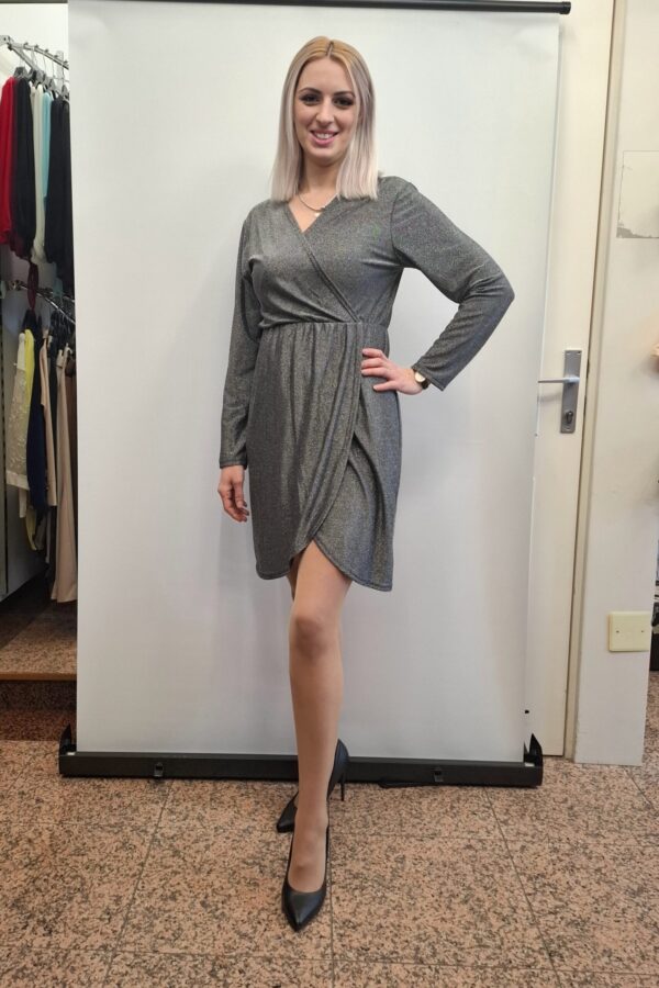 Praznična obleka z bleščicami, ki je z nabrano tkanino v trebušnem predelu je izredno laskav, saj vizualno oblikuje postavo in prikrije trebušček.