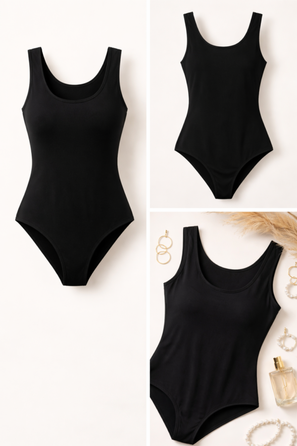 Elastičen in udoben ženski bodi z okroglim izrezom, ki se lepo prilagaja telesu. Zaradi gladkega materiala je idealen za kombiniranje z različnimi oblačili, zapenjanje spodaj na zaponke pa omogoča praktično nošenje.