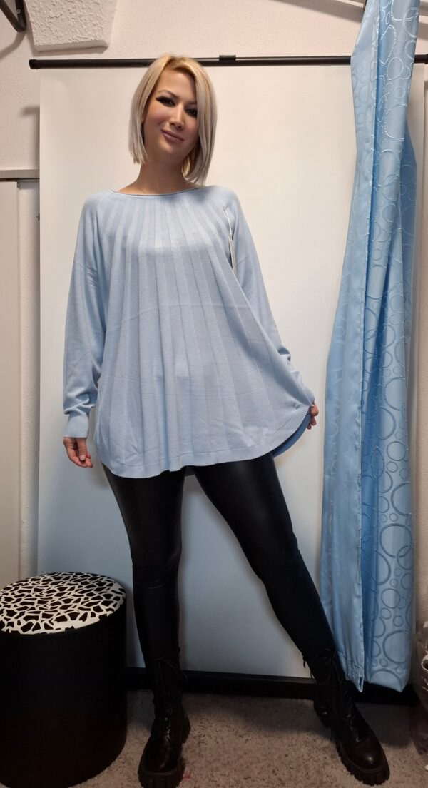 Ženski plisiran tanjši pulover/tunika, ki lepo pada na vašem telesu. V njem se boste počutili odlično, saj je mehak in topel. Ustreza tudi večjim konfekcijskim številkam.