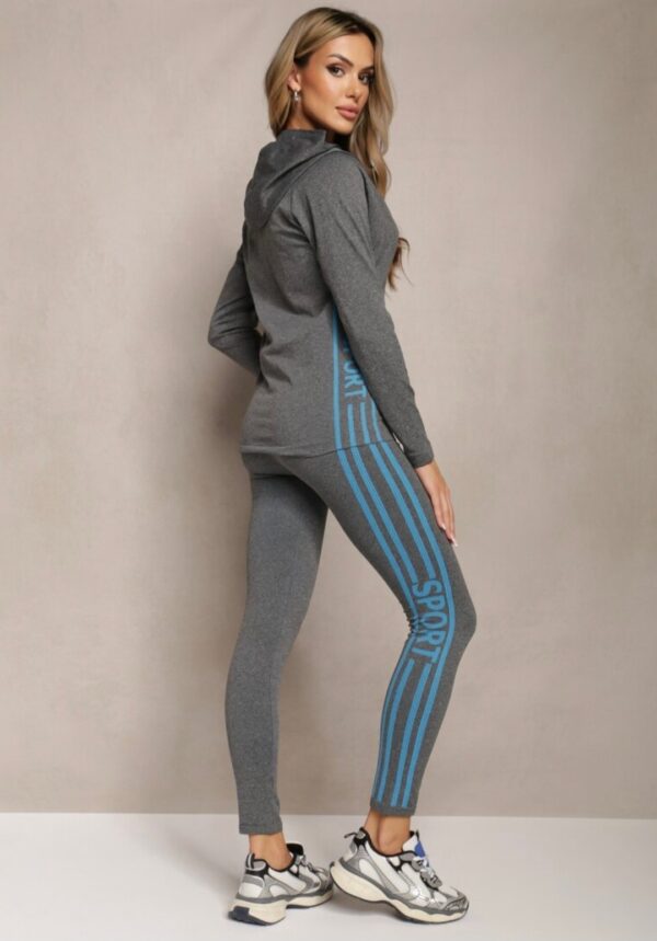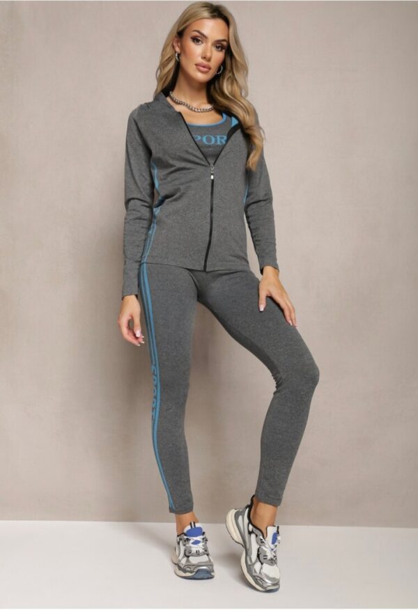 Komplet vsebuje športno jopico s kapuco, brezrokavno majico in legice.