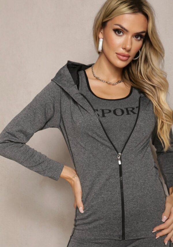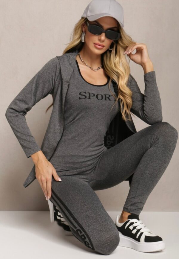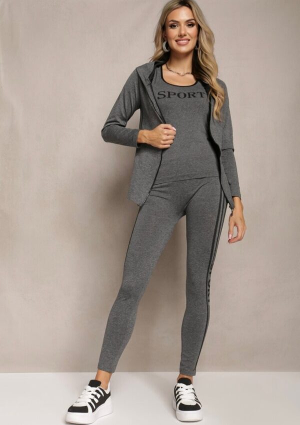 Komplet vsebuje športno jopico s kapuco, brezrokavno majico in legice.