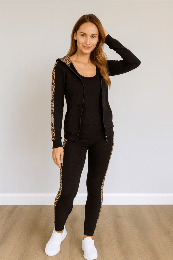 Komplet vsebuje športno jopico s kapuco in legice.