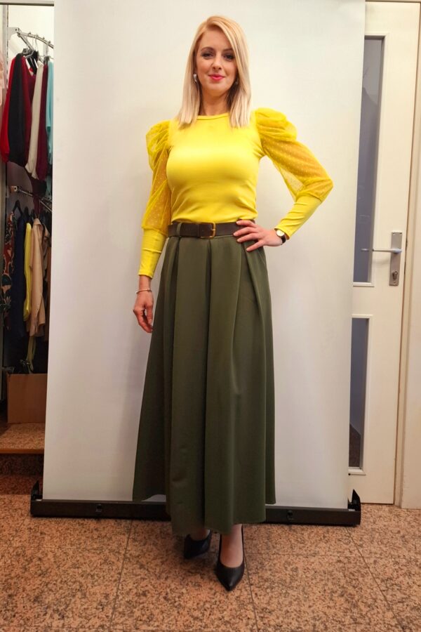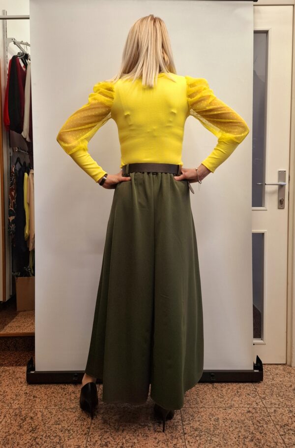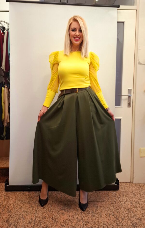 Elegantno modno hlačno krilo ima visok pas, ki lepo poudari postavo, ter široke hlačnice, ki ustvarjajo moden in zračen videz. Hlače so zelo kompaktne.